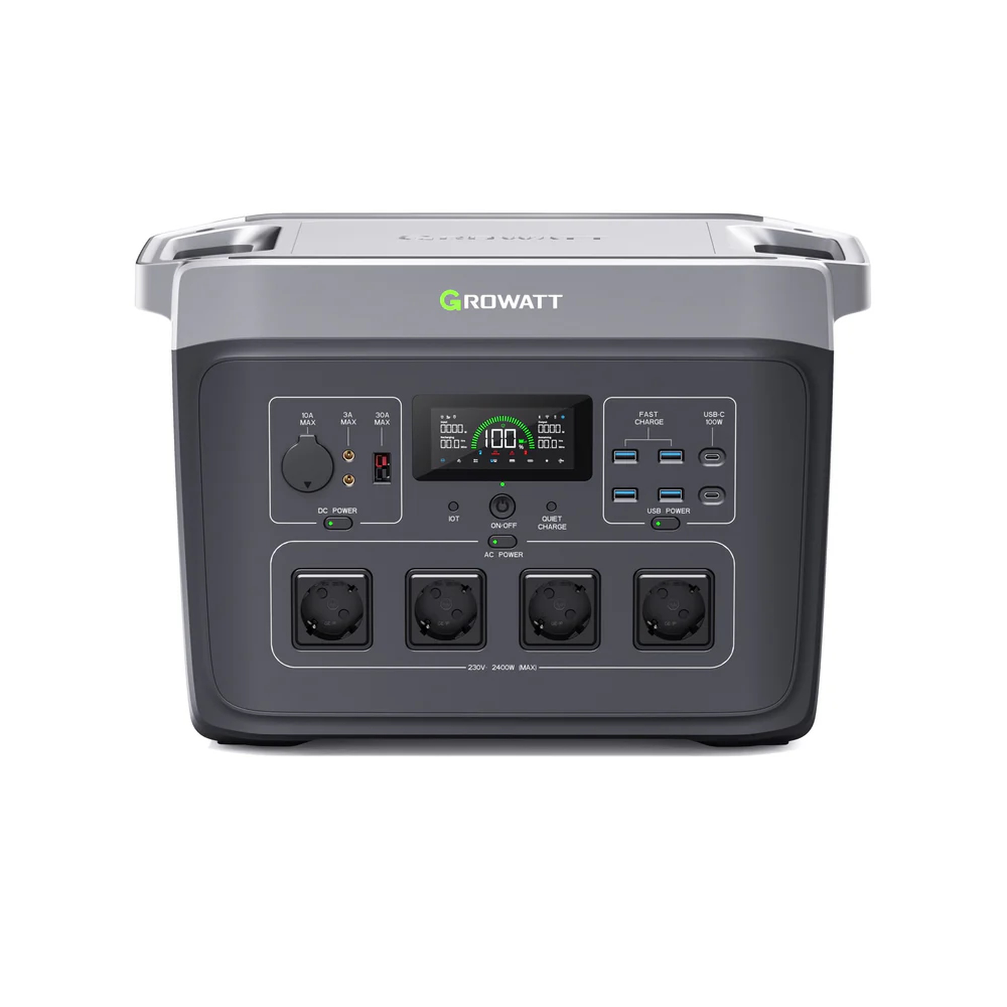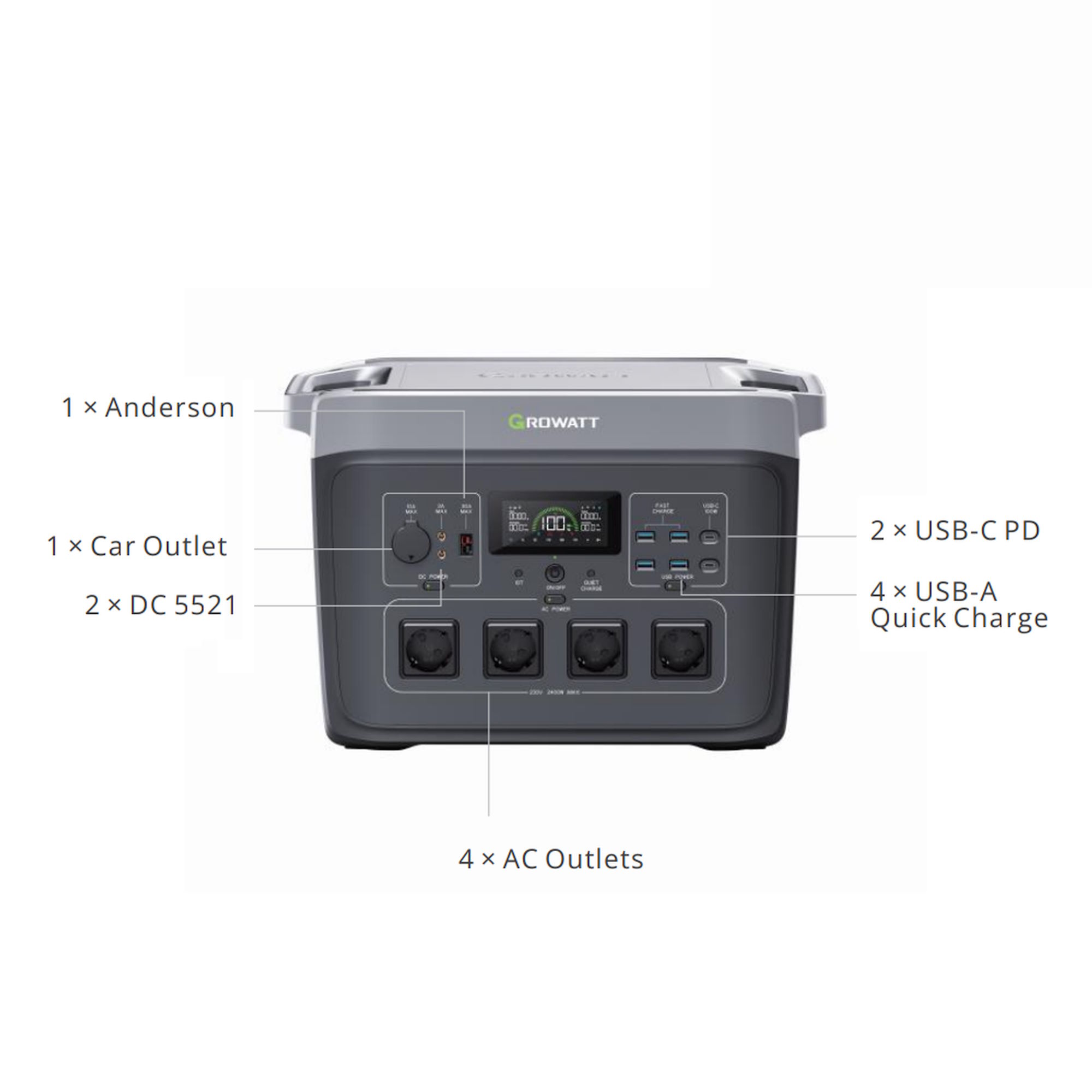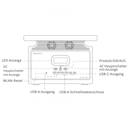 - 1x Growatt Infinity 2000 Pro Powerstation, 1x AC-Ladekabel, 1x Kfz-Ladekabel, 1x Solarladekabel,1x Benutzerhandbuch